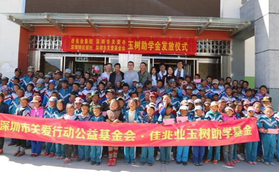 2010年4月玉树7.1级地震发生后,佳兆业集团迅速作出反应,向受灾最严重地区之一哈秀乡捐助200万元,携手深圳关爱办、深圳特区报启动了“佳兆业玉树新校园援助计划”,在最短的时间内让玉树的孩子重返校园。自地震后,佳兆业始终牵挂着玉树哈秀乡贫困的孩子学习成长,并于2011年12月携手深圳关爱办设立了“佳兆业玉树助学基金”,连续三年向哈秀乡中心寄宿学校150名贫困学子每年每人捐赠1300元,建立起了长效关爱机制。
