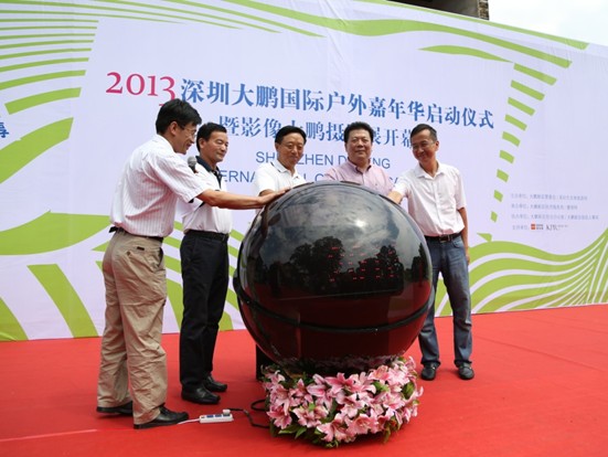 大鹏新区党工委副书记、管委会主任何永志(中)、深圳市文体旅游局副巡视员易能全(左二),佳兆业集团董事吕岳辉(右二)等共同启动第二届深圳大鹏国际户外嘉年华活动