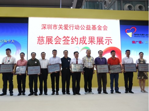 深圳市关爱基金会理事长李统书(右5)向佳兆业集团代表(左5)颁发“热心公益 大爱无疆”牌匾