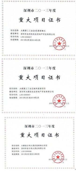 重大喜讯。2013年2月,佳兆业大鹏第二工业区B区、大鹏第三工业区和金沙湾酒店项目三个城市更新改造项目被列入深圳市2013年重大项目。同月,佳兆业在大鹏新区管委会被列为先进单位。