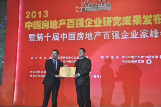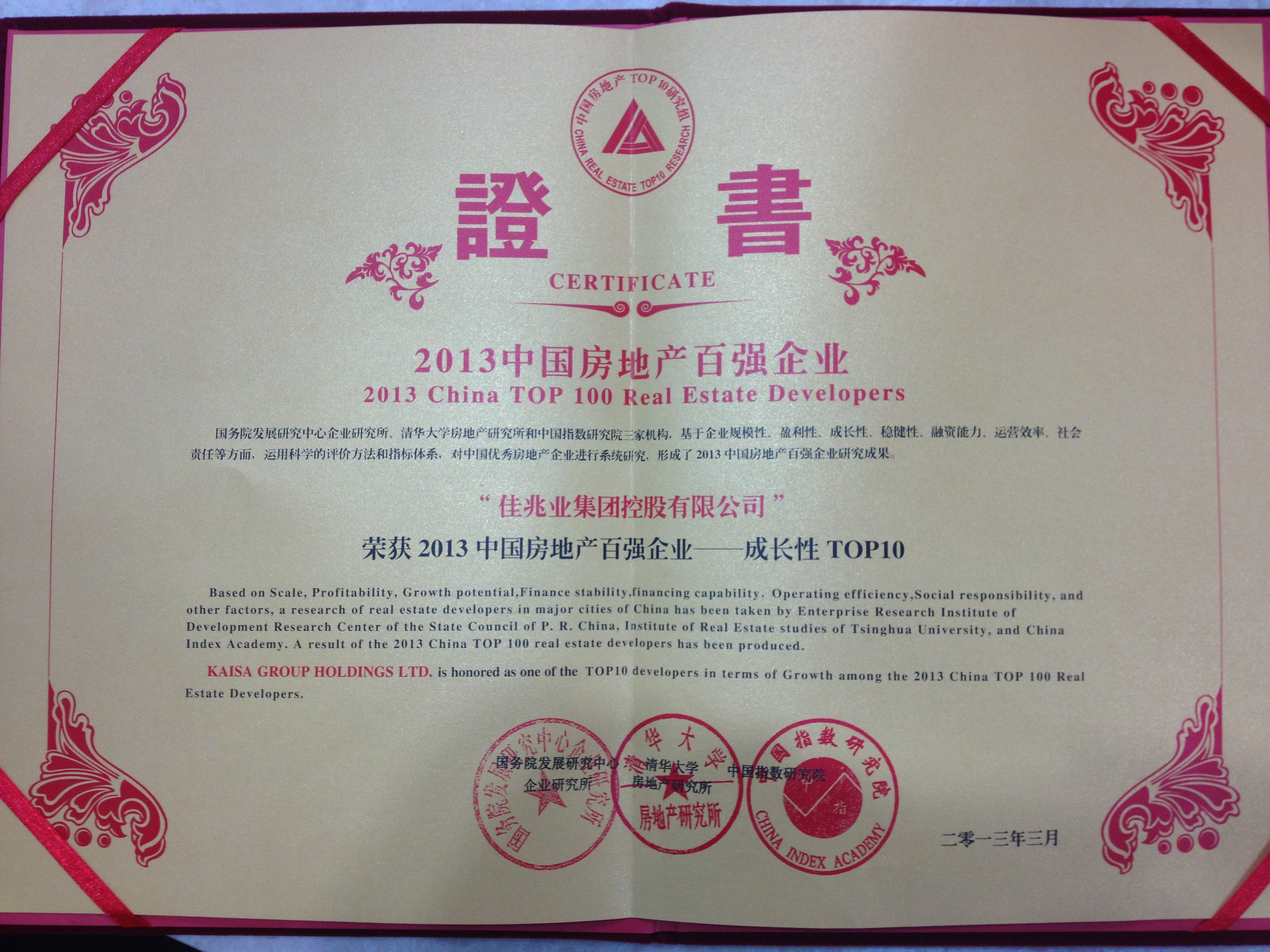 佳兆业荣获“2013中国房地产百强企业——成长性TOP”
