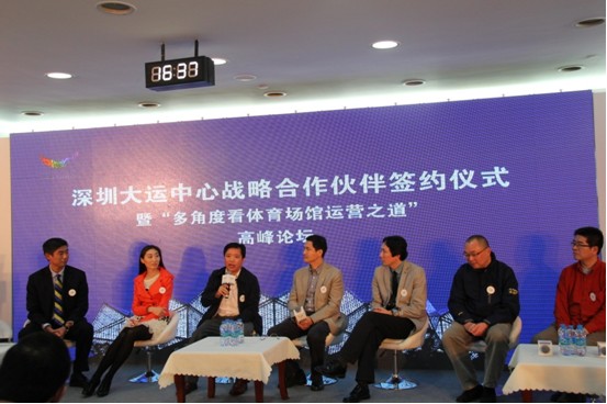 签约仪式后,上海东亚体育文化中心有限公司姚佳淳书记、北京迷笛音乐学校的张校长、北京鸟巢水立方赛事运营商北京时博国际体育赛事有限公司张震鹏总经理、聚橙网蒋宽总裁、华南师范大学体育科学学院的谭教授、深圳市奕之朋篮球俱乐部匡智总经理等多位嘉宾参加了“多角度看体育场馆运营之道”高峰论坛,与会嘉宾分别就“如何以大运中心场馆为平台,做强、做大产业链,展开多种经营最终实现品牌化的目标”;“国外优质体育场馆经营模式和方法借鉴”;“产业链上下游资源整合与体育场馆市场经营实现双赢”等多个话题展开深入讨论。