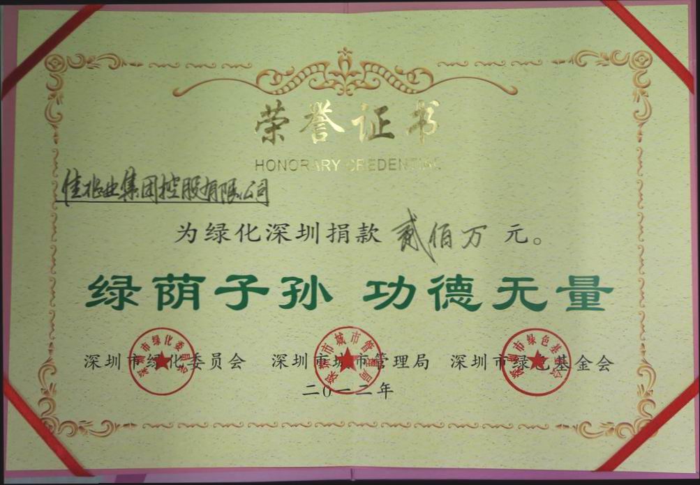 8月28日,为响应深圳市委、市政府“城市绿化提升活动”的号召,佳兆业集团捐资200万元,用于提升深圳绿化水平和生态环境质量。当天下午,“绿化深圳”义捐活动捐赠仪式在深圳市民中心B区多功能厅举行,佳兆业集团董事局副主席兼执行董事陈耿贤、集团总监周素萍等参加了本次活动,深圳市市委常委、市政府常务副市长吕锐锋为佳兆业集团颁发了荣誉证书。此外,佳兆业置业发展有限公司也积极响应大鹏新区号召,已经为本次“绿化深圳”义捐活动捐款7.8万元。