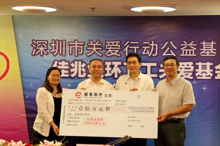 7月23日,“佳兆业环卫工关爱基金”捐赠仪式在深圳报业大厦38楼会议室举行,佳兆业集团总裁金志刚、集团总监周素萍、深圳市关爱办主任黄扬略、深圳市关爱行动公益基金会理事陈寅等出席了本次活动。为支持深圳“公益金百万行”活动,佳兆业集团不仅在7月8日派团参加了健康步行活动,本次还特意捐资100万元人民币,携手深圳关爱基金会设立“佳兆业环卫工关爱基金”,定向用于关爱深圳环卫工人群体。据悉,这也是“公益金百万行”活动迄今为止收到的最大金额捐款。