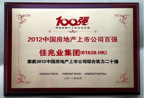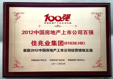 5月22日,在上海举行的“2012中国房地产上市公司测评成果发布会”上,佳兆业集团从100多家上市房地产公司中脱颖而出,荣获“2012中国房地产上市公司百强”第15名,相比去年的第24名上升了9个席位,集团行业排名再次实现“跳级”;同时,凭借出色的运营管理能力,佳兆业集团还获得了 “2012年中国房地产上市公司经营绩效五强”(获此奖项的还有中海、龙湖、恒大、融创,排名不分先后)。