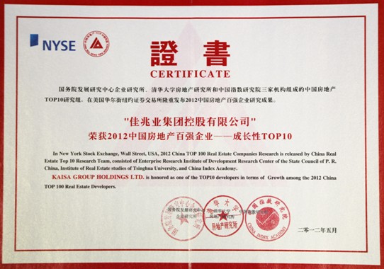 3.佳兆业集团荣获“2012年中国房地产百强企业——成长性TOP10”称号