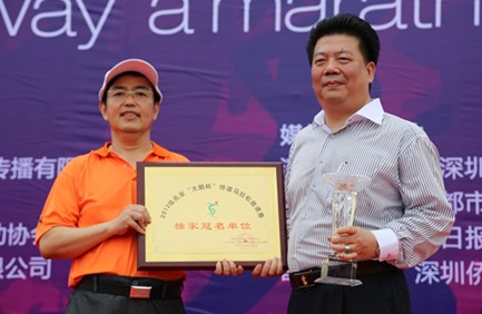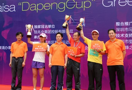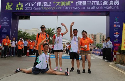 4月15日,由深圳市大鹏新区管委会主办、佳兆业集团独家冠名赞助的“2012佳兆业杯大鹏半岛绿道马拉松赛”正式开锣。本次赛事吸引了来自海内外近千名马拉松爱好者参加,佳兆业集团也派出代表队参加了本次比拼,置业公司及惠州公司董事长吕岳辉、集团总监兼置业公司总经理耿延良等高管出席活动,并现场为佳兆业鼓劲助威。经过一番激烈角逐,半程马拉松、10公里体验马拉松和10公里体验马拉松团体三个组别冠军归属尘埃落定,李源、深圳长跑网代表队等个人和团队斩获冠军。颁奖典礼上,耿延良发表致辞并为10公里团体组获奖者颁奖;吕岳辉代表佳兆业接受大鹏新区管委会颁发的纪念品,并为男子半程组获奖者颁奖。