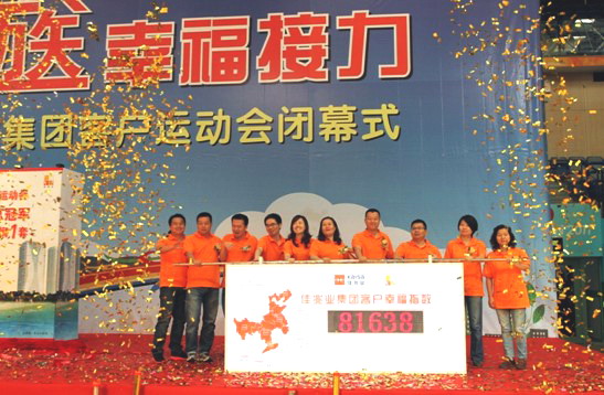 最后,幸福指数启动仪式将活动推向了最高潮,佳兆业集团总监周素萍、佳兆业物业管理中心总经理綦海生、集团传媒及公共关系管理部总经理李小刚、客户服务部总经理助理钟妤、佳兆业集团绥中公司营销总监邵华锋等高管及嘉宾,一同拉起业主幸福指数启动杆,点亮启动台,发布了2012年佳兆业集团的业主幸福指数——81638,宣告第四届集团客户运动会圆满落幕!