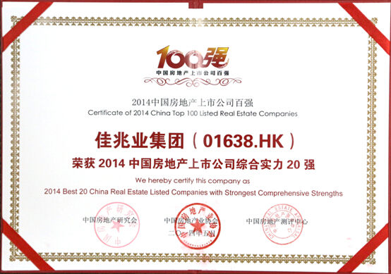 佳兆业荣获“2014年中国房地产上市公司百强”第15名