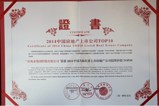 佳兆业荣获“2014中国大陆在港上市房地产公司”投资价值TOP10