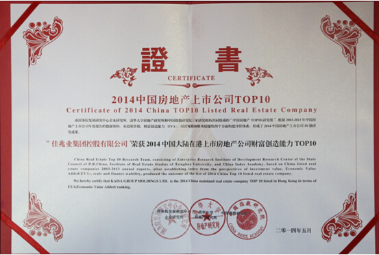 佳兆业荣获“2014中国大陆在港上市房地产公司”财富创造能力TOP10