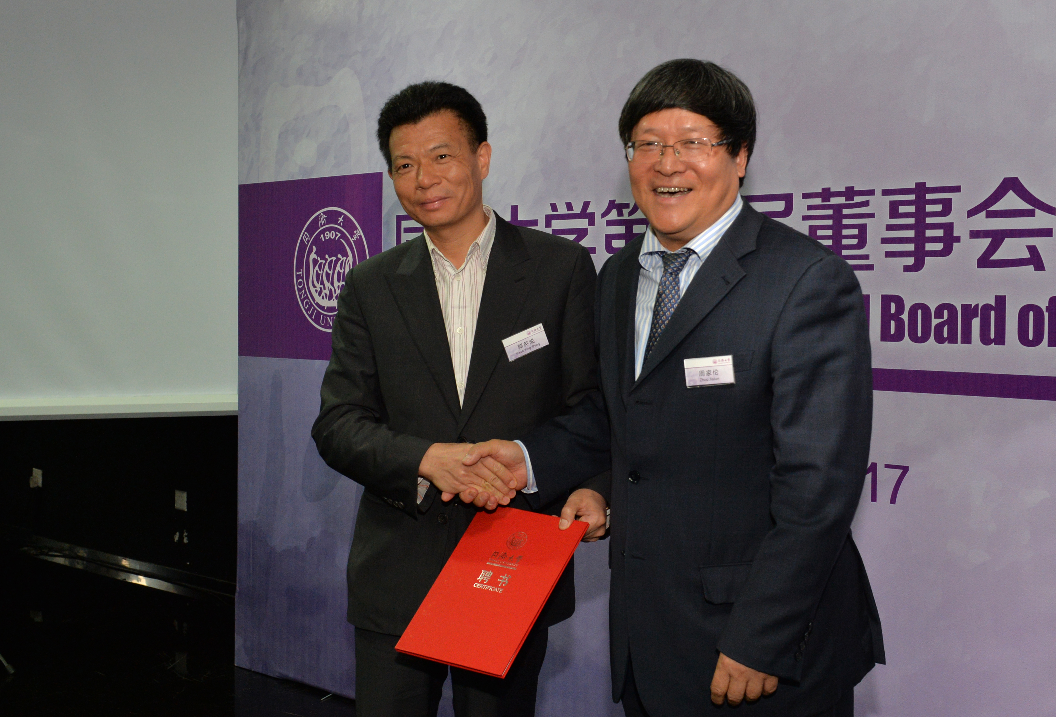 5月17日,同济大学第二届董事会第四次全体会议在上海召开。会上,同济大学董事会主席周家伦正式向佳兆业集团董事局主席郭英成授予“第二届董事会董事”的聘书。