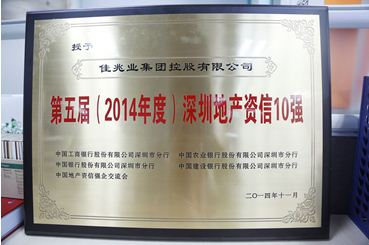 2014年11月29日,“资·信”地产金融峰会暨第五届深圳地产资信十强颁奖典礼在深圳阳光酒店隆重举行,人民网原总裁、中地会理事长何加正,工、农、中、建四大国有银行相关负责人,人民网华南中心总经理、总编辑徐静,佳兆业集团董事局副主席兼执行董事孙越南,佳兆业金融集团副总裁马玉春等出席颁奖典礼。会上,第五届(2014年度)“深圳地产资信十强”揭晓,佳兆业集团连续第三年获得该荣誉,佳兆业的资信实力再次获得国内权威金融机构的肯定。