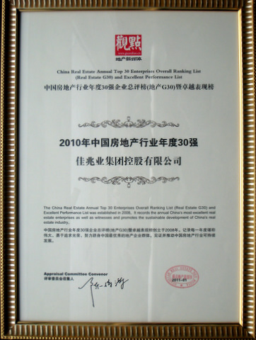 1月6日,在观点地产新媒体举办的“重铸竞争力”城市观点论坛中国行2010年度论坛中,佳兆业集团以其卓越的表现,入选中国房地产行业年度30强企业总评榜(地产G30)。此前不久,佳兆业集团刚刚宣布了截至2010年底,集团的总销售额突破了100亿元人民币,同比增长超过了67%,土地储备达1750万平方米,较2009年增加了约4成,足够满足其未来三至五年的发展需求。