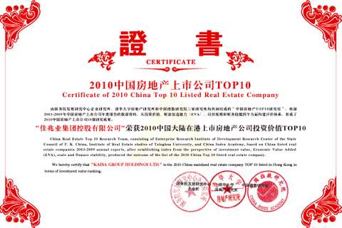 由国务院发展研究中心企业研究所、清华大学房地产研究所和中国指数研究院三家研究机构共同组成的“中国房地产TOP10研究组”,根据中国房地产上市公司年度报告的数据资料,从投资价值、财富创造能力,经营规模和财务稳健四个方面构建评价体系,形成了2010中国房地产上市公司10强研究成果。佳兆业集团凭借自身综合实力荣获2010中国大陆在港上市房地产公司投资价值TOP10。