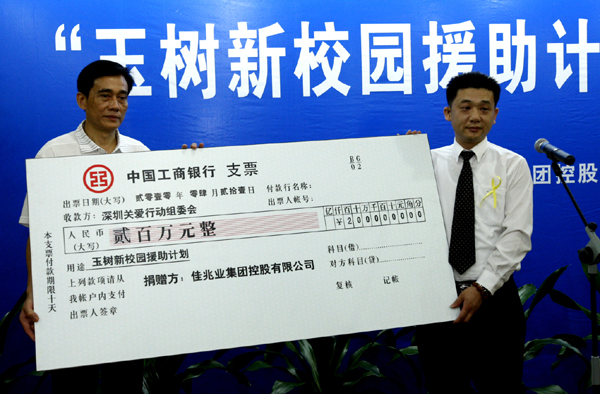 4月21日上午,佳兆业集团向深圳市关爱办捐助由员工捐献及企业出资的善款200万元,启动“玉树新校园援助计划”。这一捐资将用来帮助玉树当地学校兴建板房教室、购置新桌椅和图书等物品。启动仪式上,全体肃穆,为青梅玉树地震同胞深切默哀。