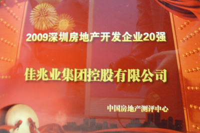 近日,从中国房地产测评中心传来好消息,佳兆业集团入选“2009深圳房地产开发企业20强”。佳兆业集团从深圳起步,经过十年的发展,逐步成长为布局深圳、广州、上海、北京、成都、无锡等全国十多个大中城市的大型综合性房地产集团,其雄厚的开发实力与进取创新责任的企业形象获得市场的广泛赞誉,并在行业奠定了自已的品牌地位,品牌价值逐年得到提升。
