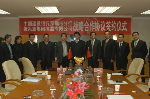 【香港,二零一零年一月八日】中国内地知名地产发展商─佳兆业集团控股有限公司(「佳兆业」或「公司」,及其附属公司,统称「集团」;股份代号:1638)宣布与中国建设银行股份有限公司深圳市分行(「建设银行深圳分行」)签订战略合作协议。 根据双方合作协议,建设银行深圳分行将在未来三年向佳兆业提供人民币50亿元的意向性授信额度。双方将把对方作为重要的长期战略合作伙伴,在房地产开发贷款、商业物业抵押贷款、搭桥贷款、并购贷款等各种融资及服务领域开展广泛合作。