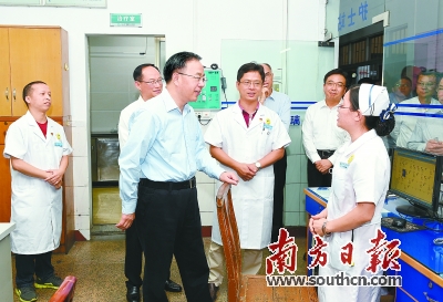 在台山市人民医院、妇幼保健院和中医院,胡春华详细了解县级医院人才队伍、设备设施、医药改革、管理运营等情况,并深入医院科室看望医生、护士和患者,听取他们的意见建议。医卫人员反映,人才缺乏是县乡医院目前发展的最大难题。胡春华要求有关部门加强政策支持,解决人才进不来、留不住等现实问题,切实增强医院医疗服务能力。在都斛镇卫生院和广海镇中心卫生院,卫生院负责人介绍了门诊数量、病患类型、医生构成和工资待遇等情况。胡春华与医护人员深入交谈交流,详细了解大家对基层医院和个人发展的想法,强调要进一步加大基层医院投入力度,提高诊疗水平,增强群众对基层医院的信任,切实解决看病难的问题。